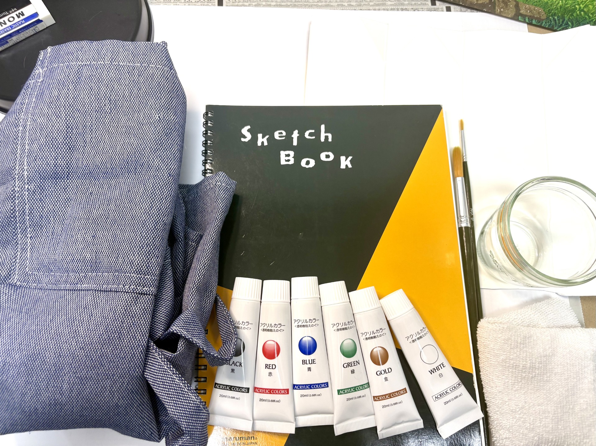 ↑左から、エプロン(100均のもの)、スケッチブック、絵の具(100均)、筆、牛乳パックパレット、水入れ(モロゾフプリンの容器を再利用!)、ぞうきん(使い古しのタオル)。