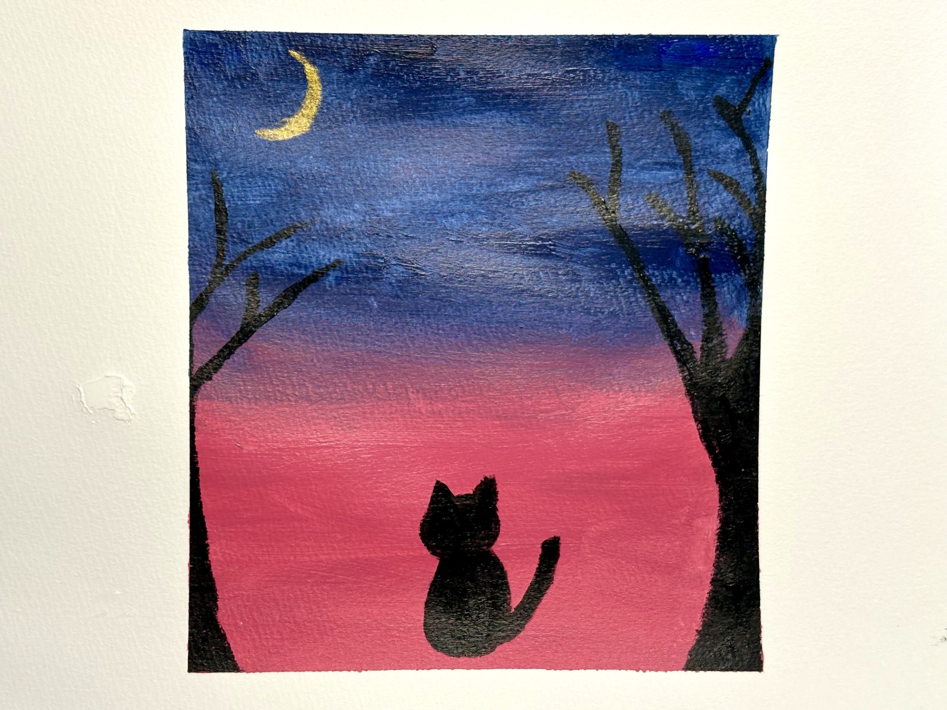 2)乾いたら、黒で木・家・猫・鳥などをシルエット風に描く |