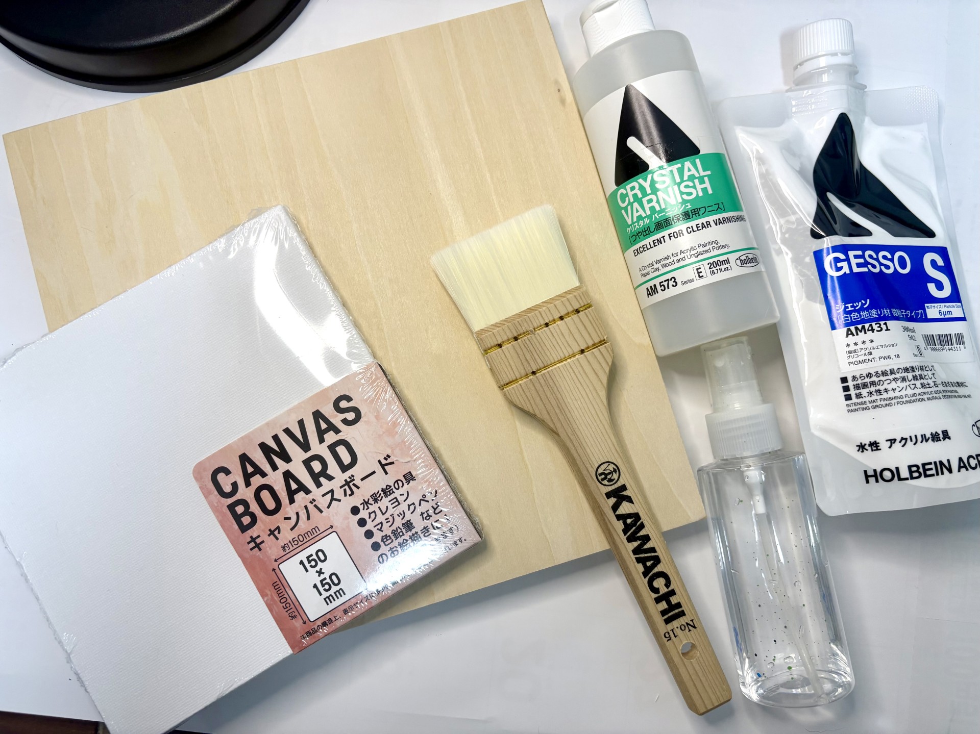 ↑左から、キャンバスボード(100均のものです)、木製パネル、ハケ、ニス、水スプレー、ジェッソ。