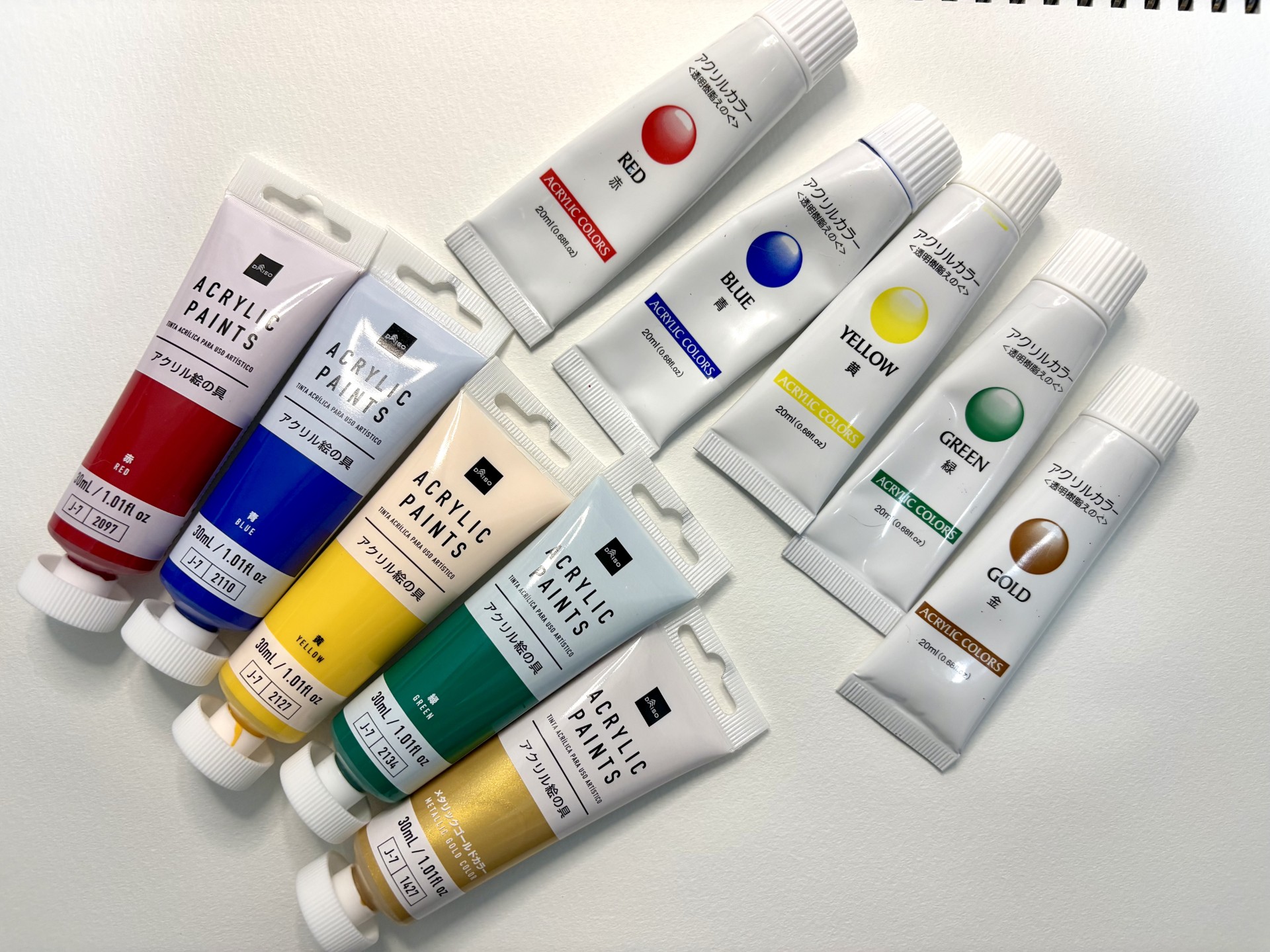 最近では、ダイソーやセリアなどの100円ショップでも手軽にアクリル絵の具が手に入ります。