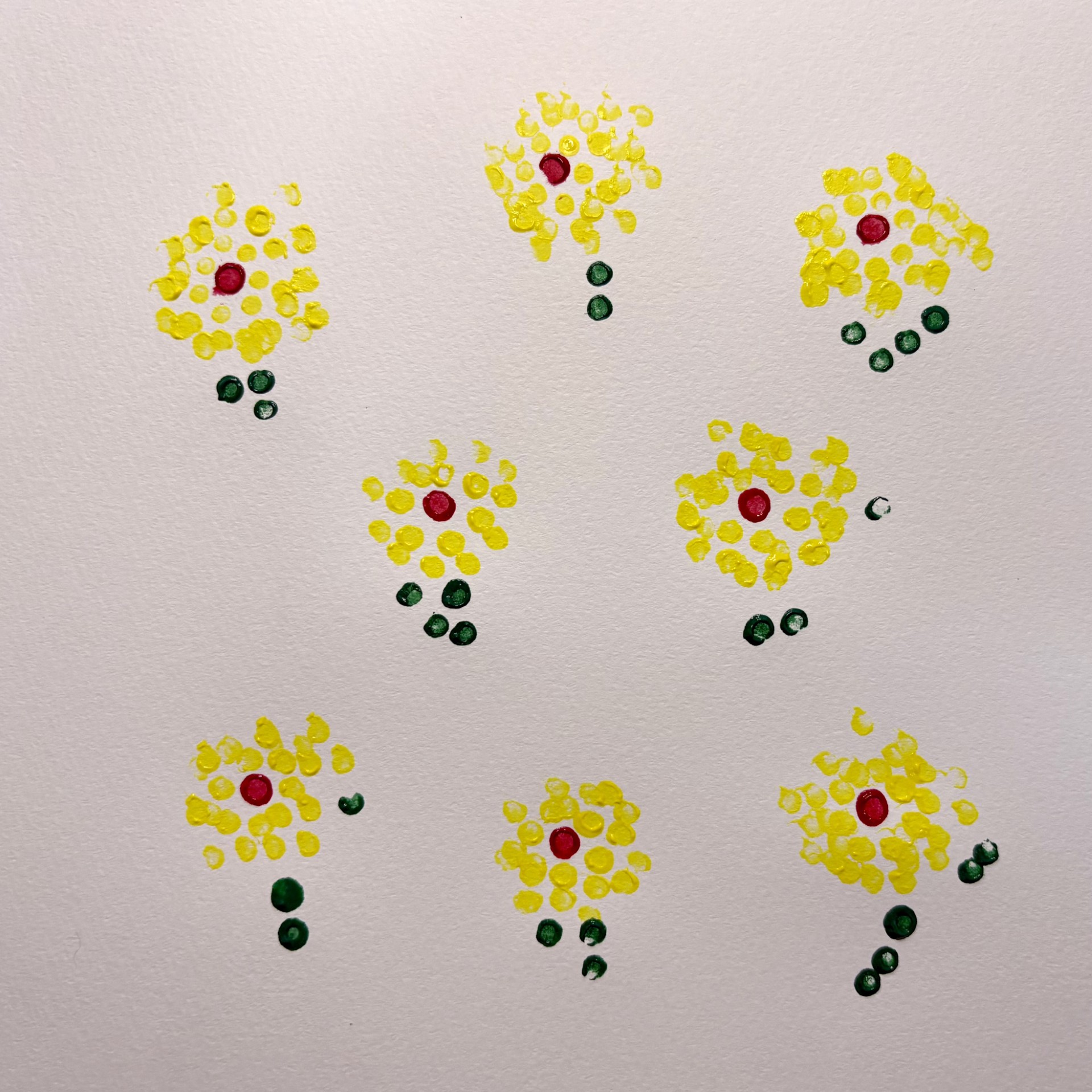 薄いピンクの絵の具を綿棒の束の先に付け、枝の周りにリズムよく色を乗せていきます。
