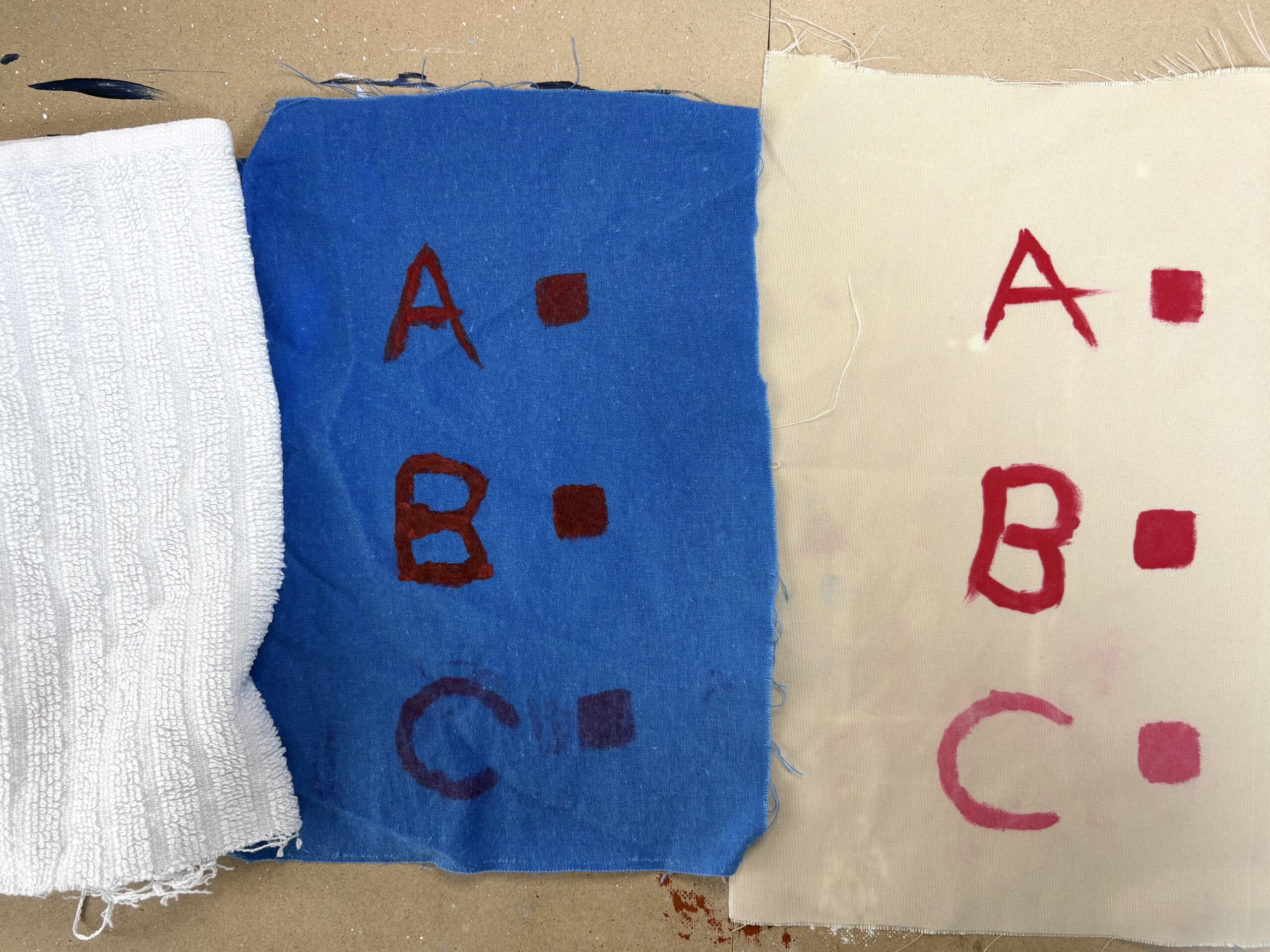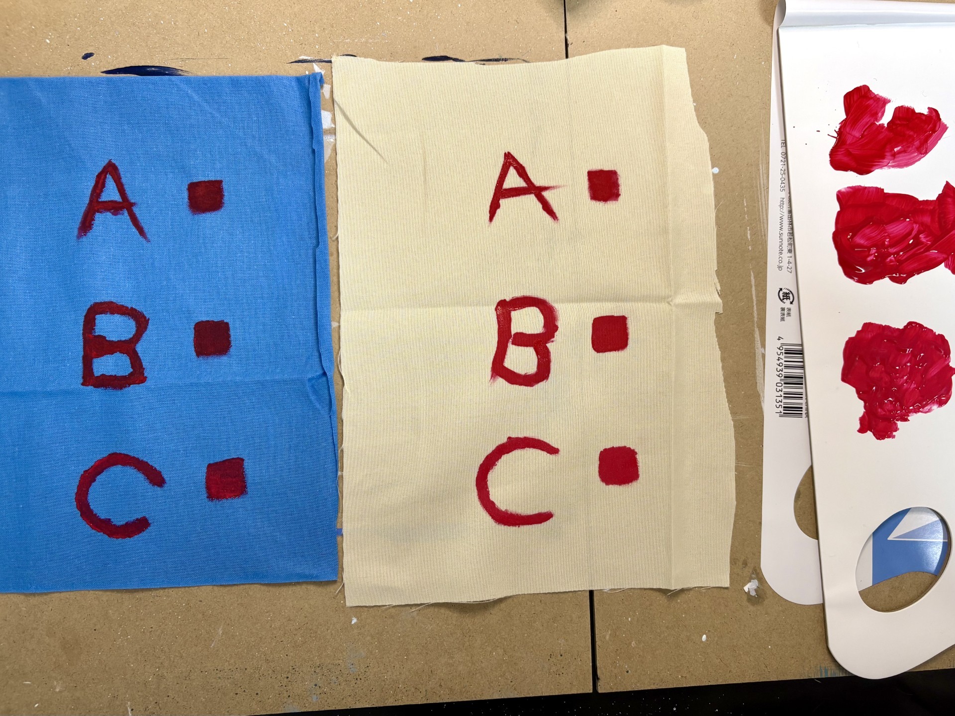 アクリル絵の具は、上から(A)アクリル絵の具のみ、(B)アクリル絵の具+ファブリックメディウム、(C)アクリル絵の具+木工用ボンドです。