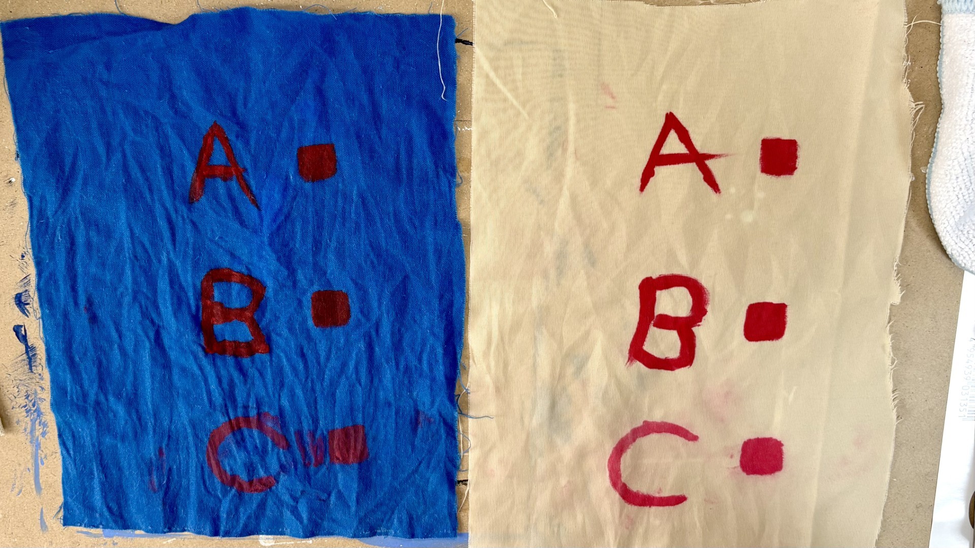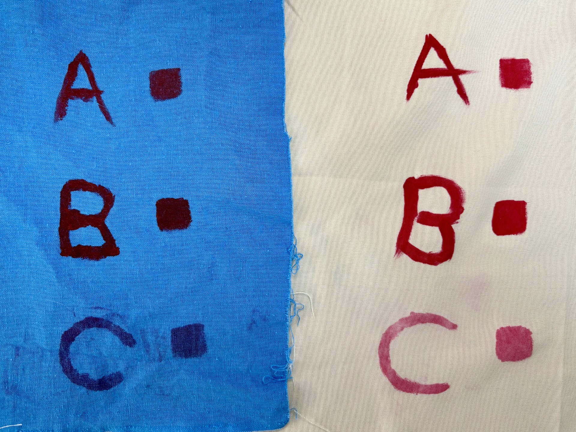 この3種類の絵の具を「綿」と「ポリエステル」それぞれに塗布して、染まり具合を検証します。