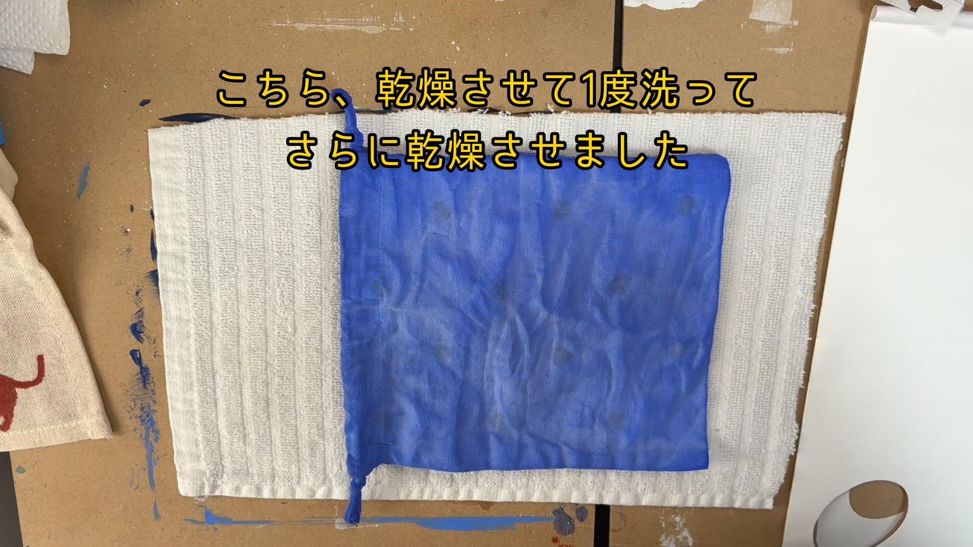 前章の実験結果からもわかるように、しっかり乾かしてアイロン固定したにもかかわらず、1度目の手洗いで色が流れてしまいました。