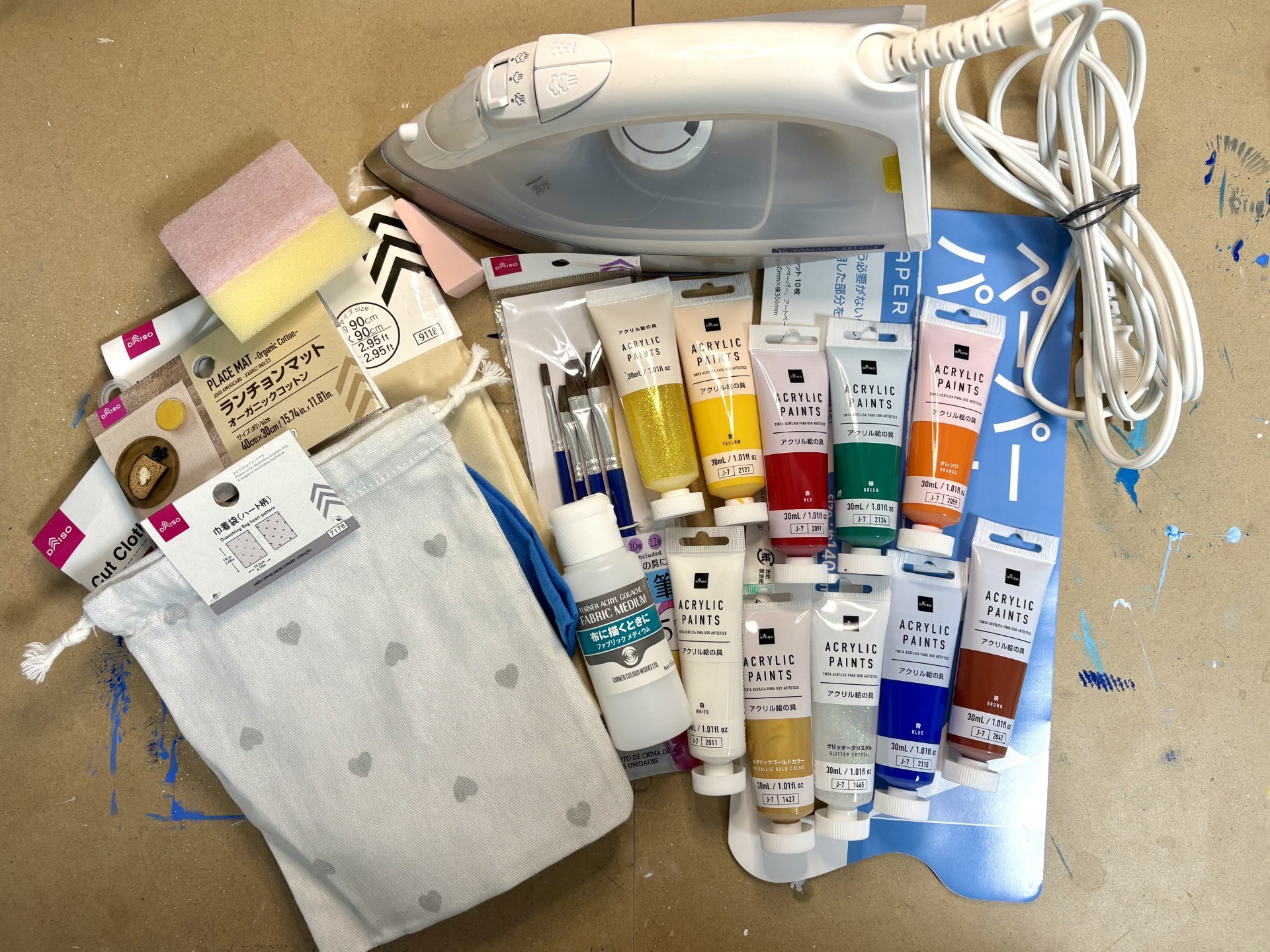 ■↑今回、使用した物品。アイロンとファブリックメディウム以外はダイソーです。