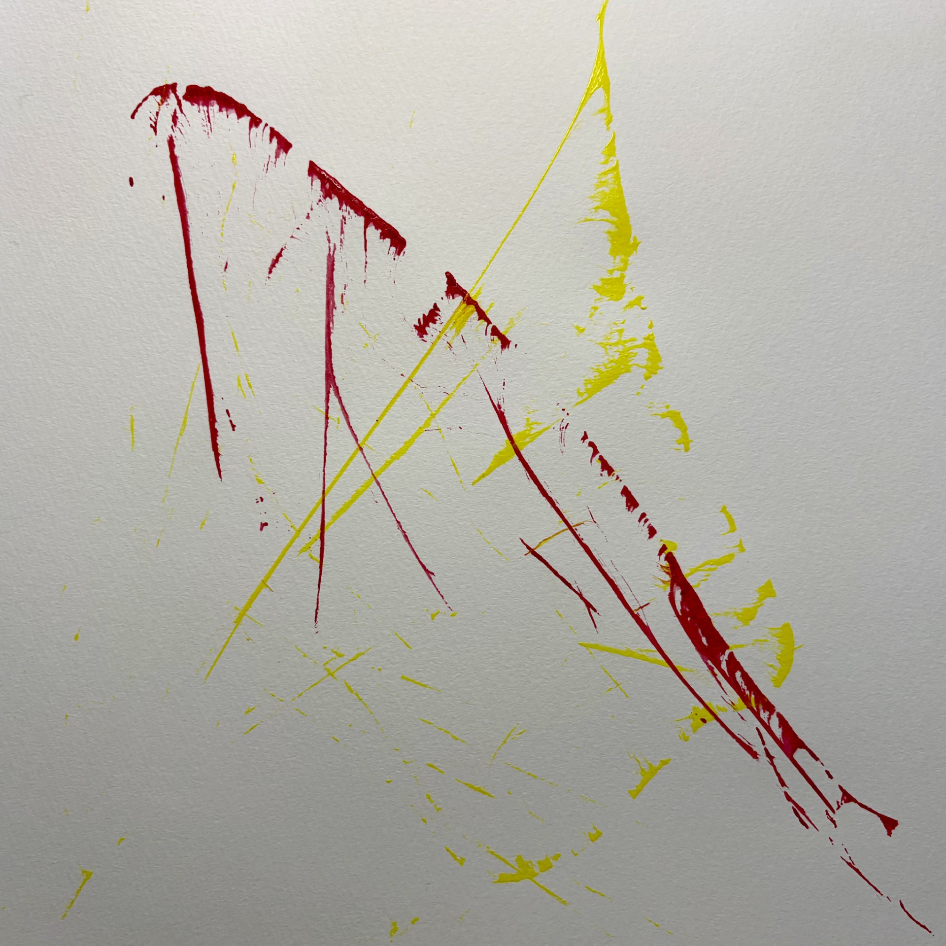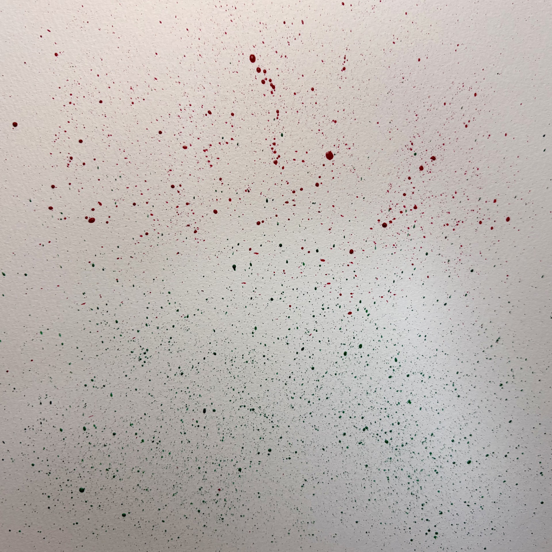 | 感想 | 最初は、思いがけない方向に飛んでいく可能性があるので、紙の周りを新聞紙などで保護しておくと安心です。上側の赤い色はかたい毛の筆で、下側の緑色は歯ブラシでやってみました。歯ブラシはよく飛ぶのですが、飛びすぎ注意です。 |