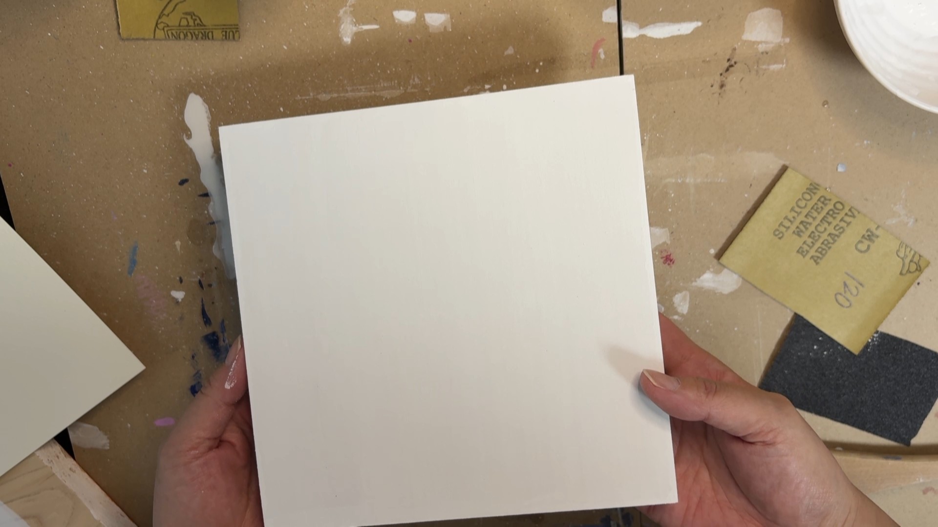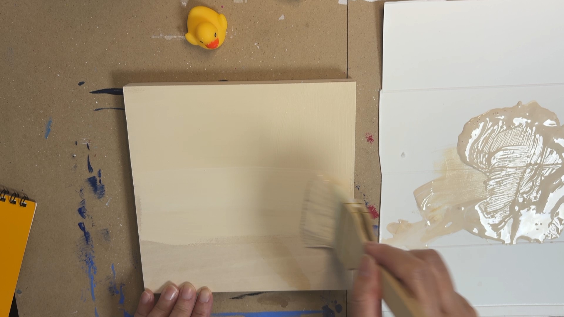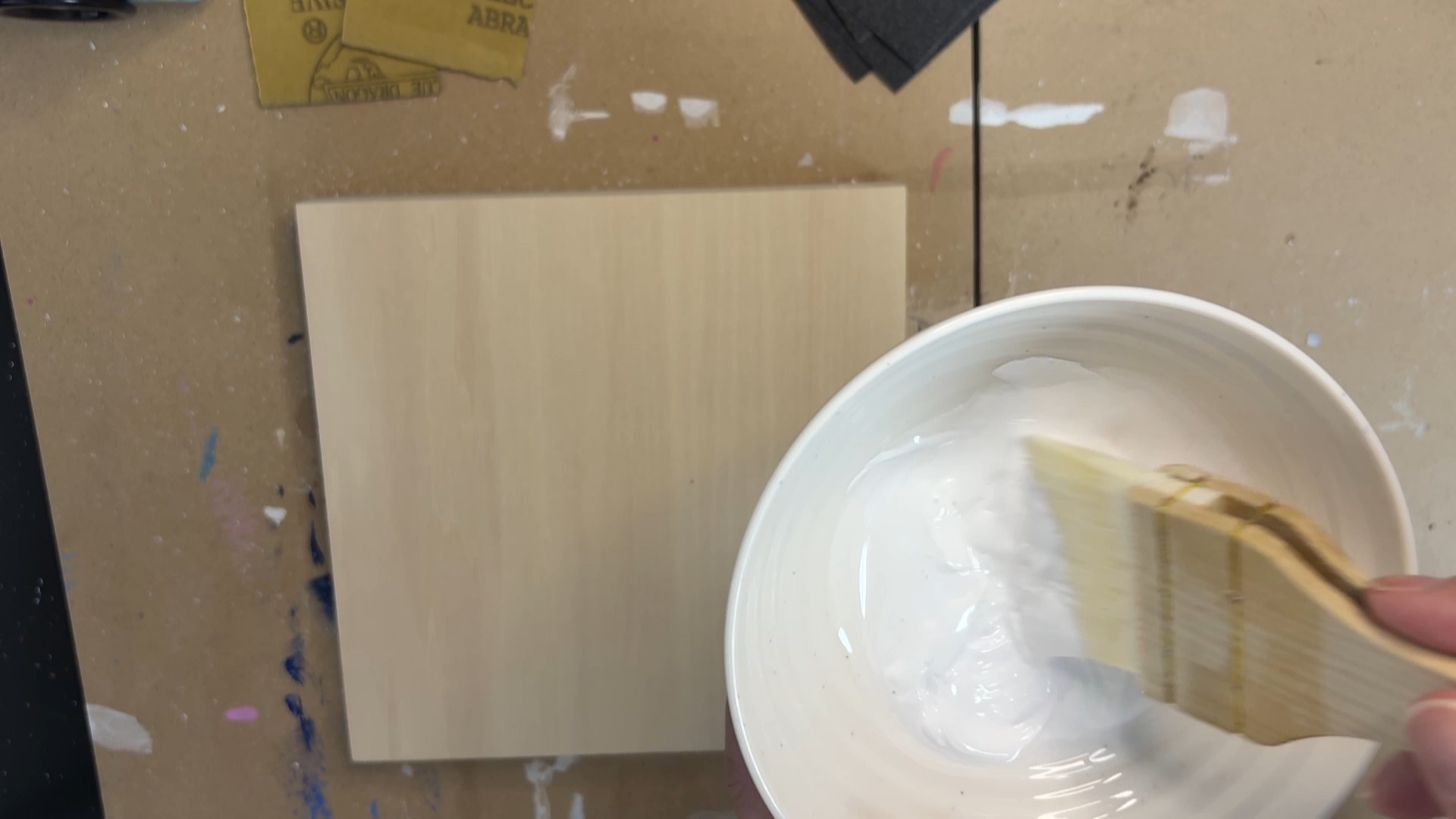■↑ホルベイン・ジェッソにアクリル絵の具を混ぜてカラージェッソにして塗っているところ。