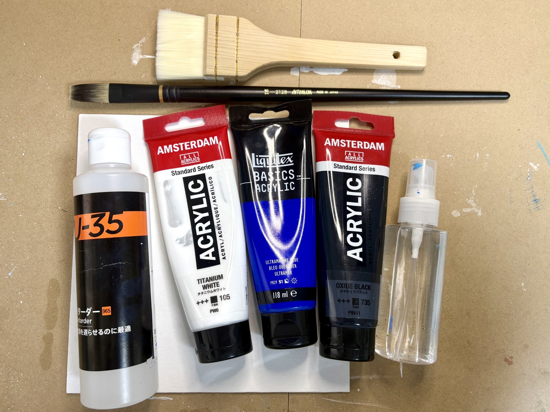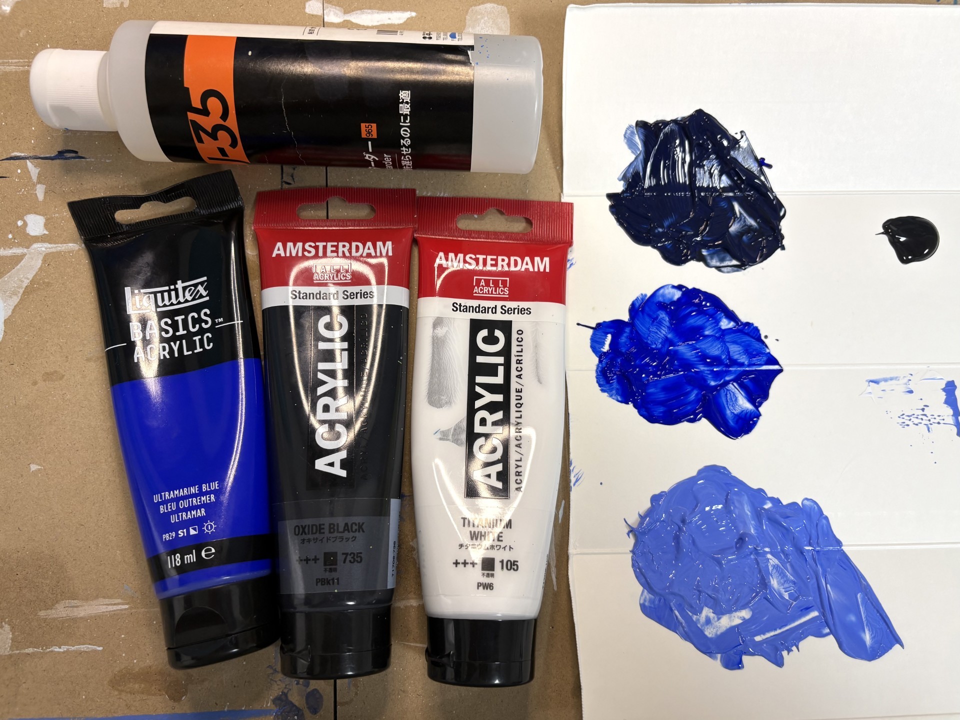黒(アムステルダム・オキサイドブラック) 青(リキテックスベーシックス・ウルトラマリンブルー) KAWACHI刷毛No.15
