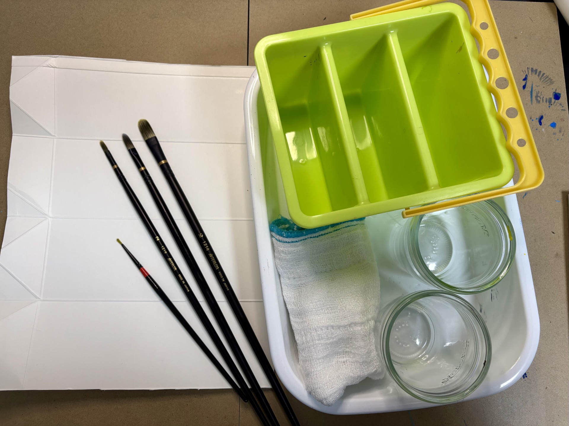 - 必要な道具は筆、パレット、水入れ(洗浄用と希釈用の2つが必須!)