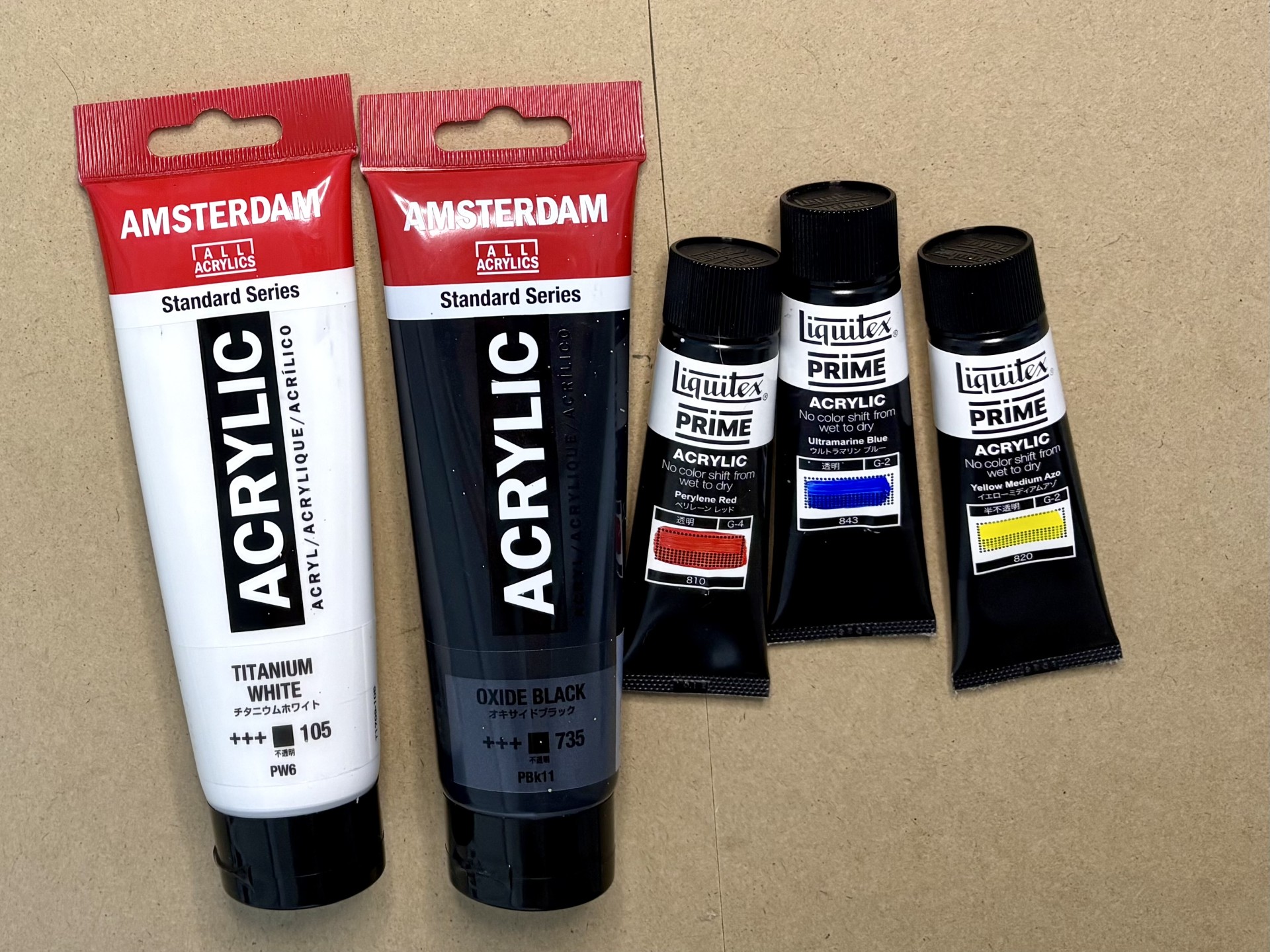 絵の具は、顔料の濃度や耐久性によって「アクリルガッシュ」と「アクリル絵の具(リキテックスなど)」に大別されます。