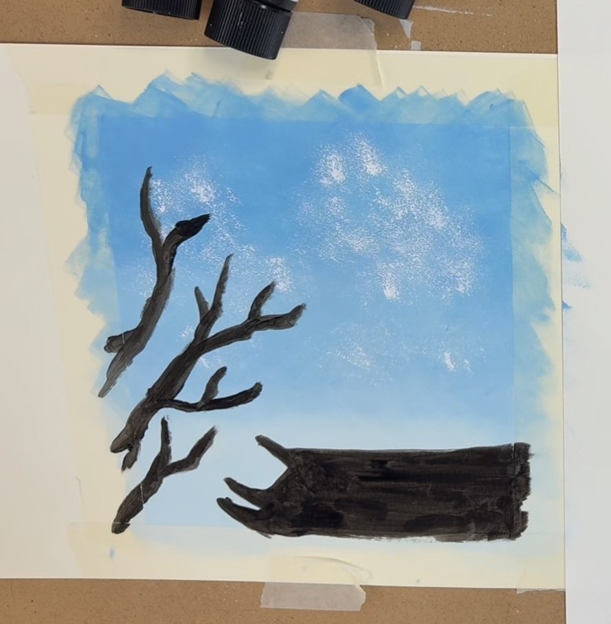 スポンジにつける絵の具は「カスカス」になるくらい落としてからでOK! 優しいタッチで叩くと、リアルな雲になります!