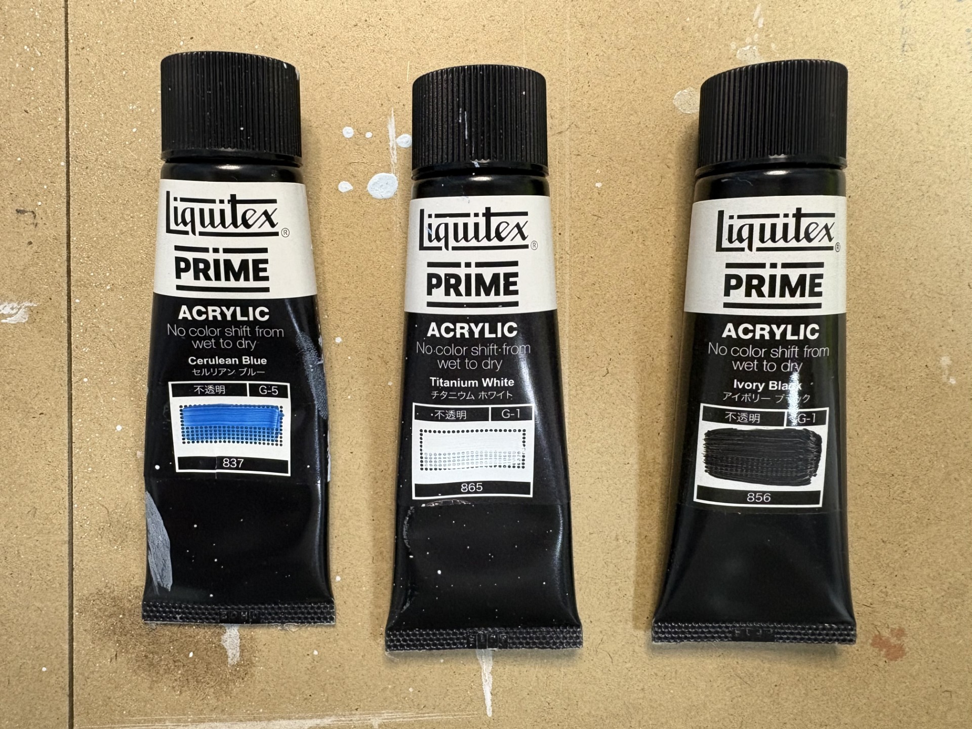■↑「青」「白」「黒」のアクリル絵の具(リキテックスプライム)。左からセルリアンブルー、チタニウムホワイト、アイボリーブラック。