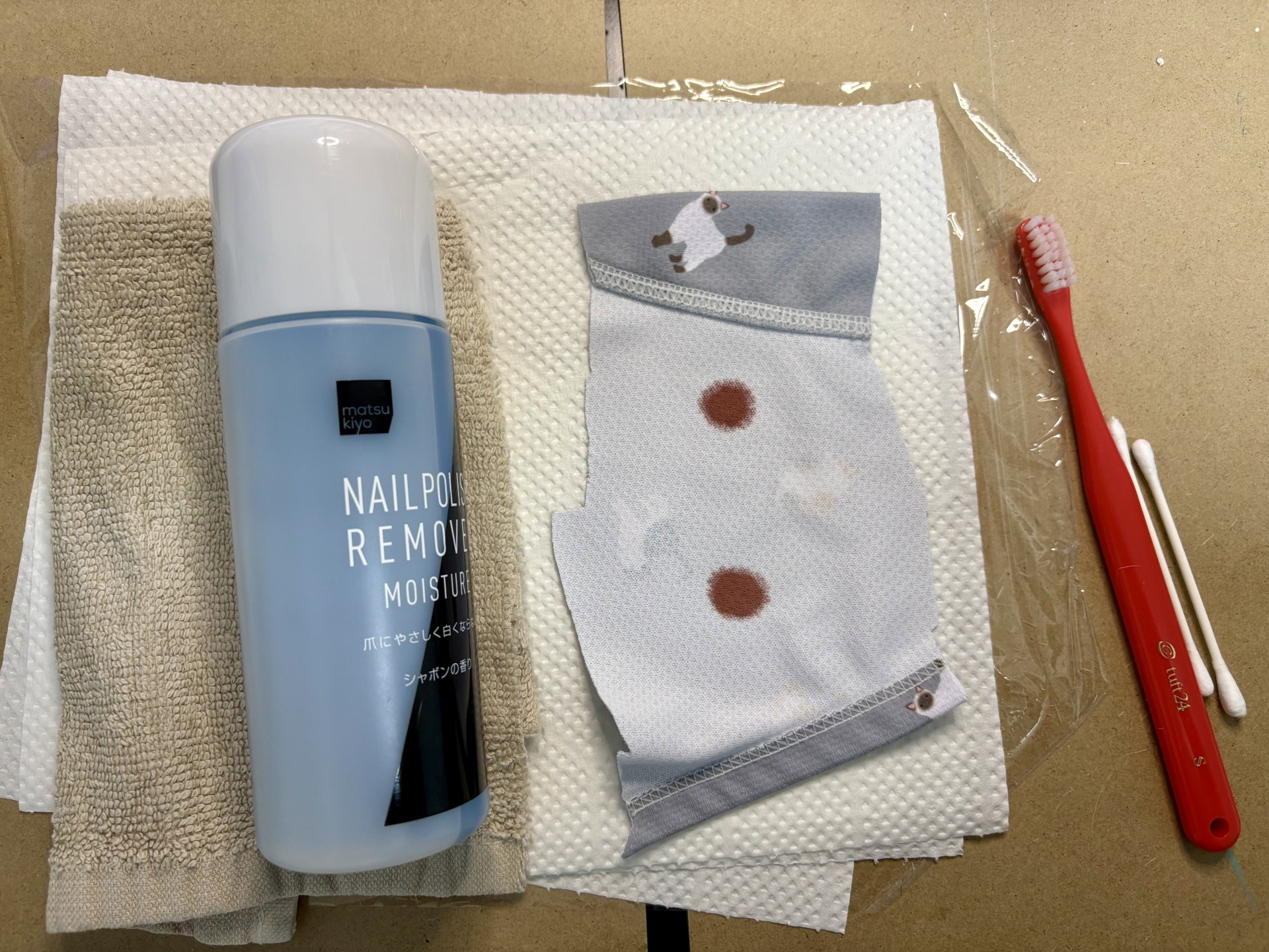 除光液を直接振りかけると、素材を傷めるだけでなく、強烈な臭いも広がってパニックになります。必ず綿棒などに含ませて少しずつ使いましょう。