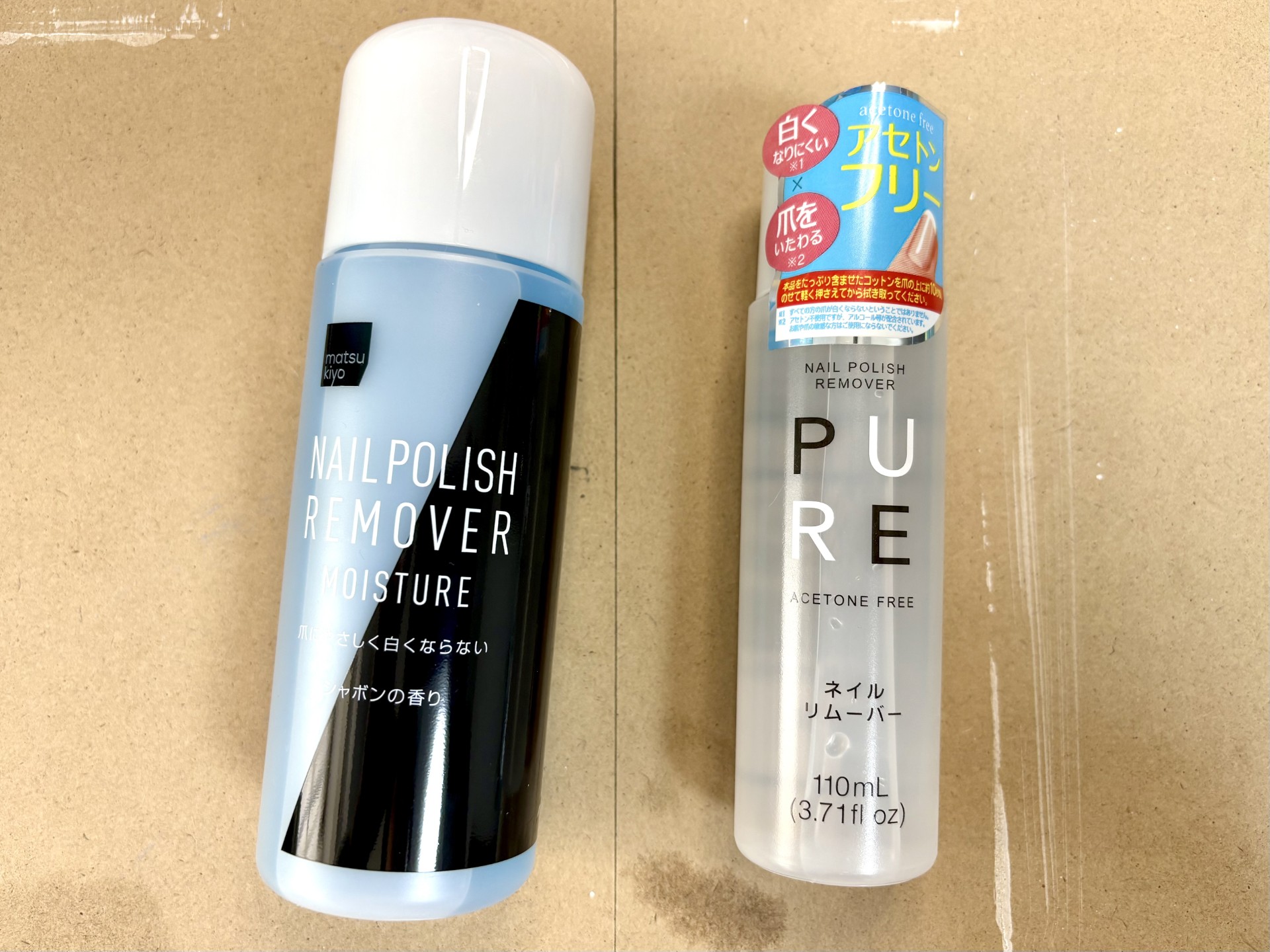 ■↑除光液2種類。左側が「アセトン配合」。右側が「アセトンフリー」。