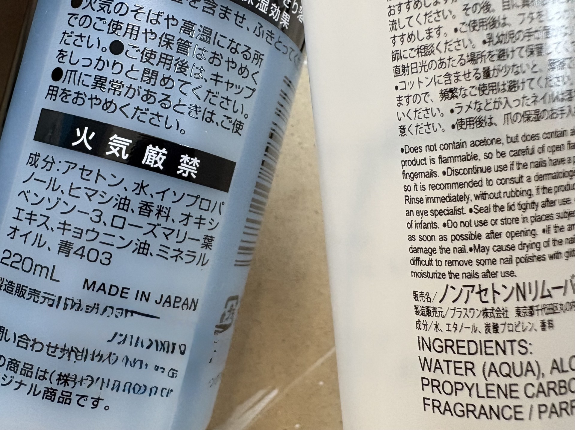 ■↑除光液の成分表示。左側(水色のボトル)は成分に「アセトン」と書かれています。