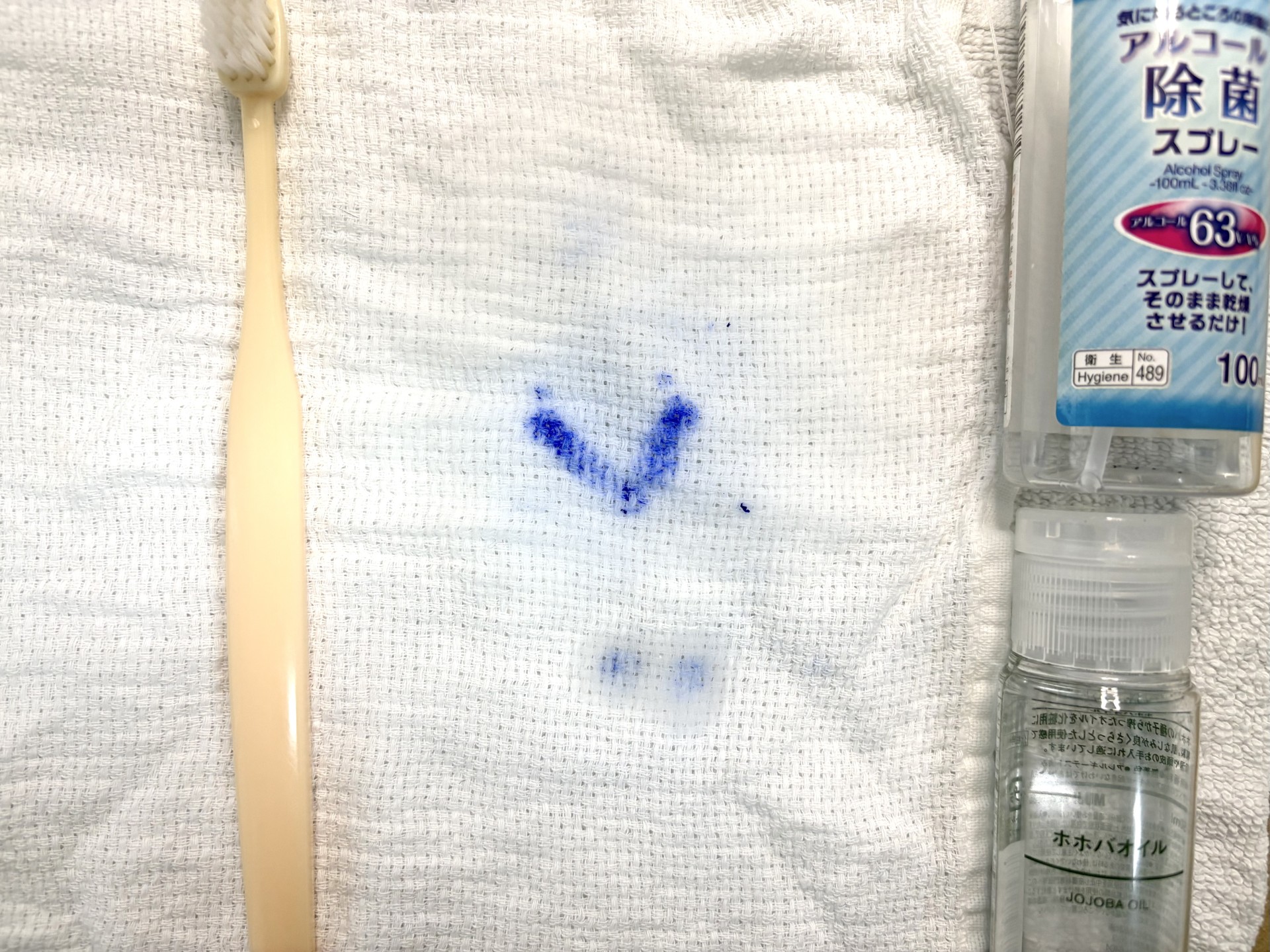 - 落ちない場合は、アルコール(エタノール)を試しますが、変色リスクがあるため必ず目立たない場所でテストしてください。