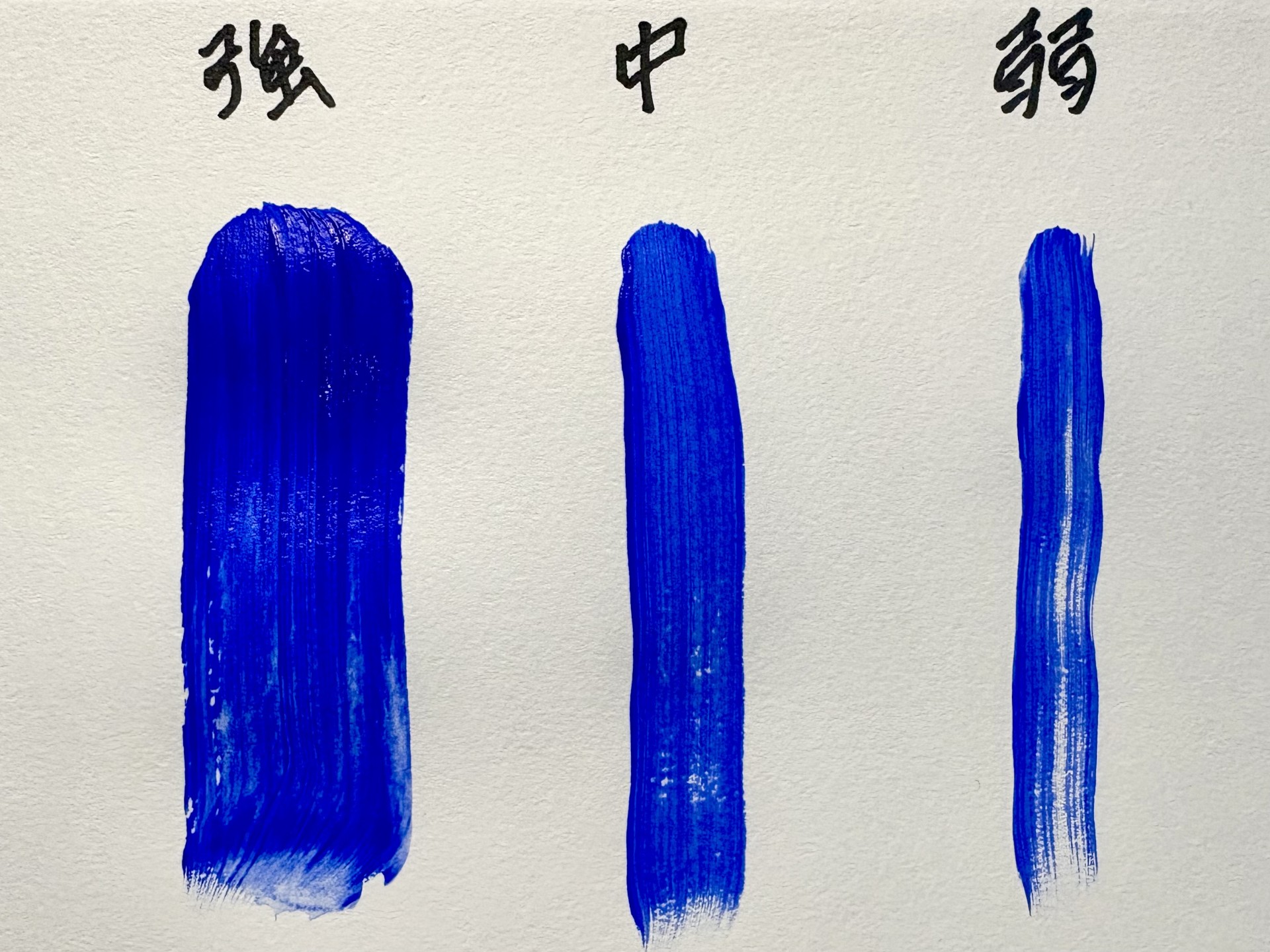 | 強 | 穂先すべてが折れ曲がるくらい | 最初は絵の具がたくさん着くが、途中からかすれる。 |