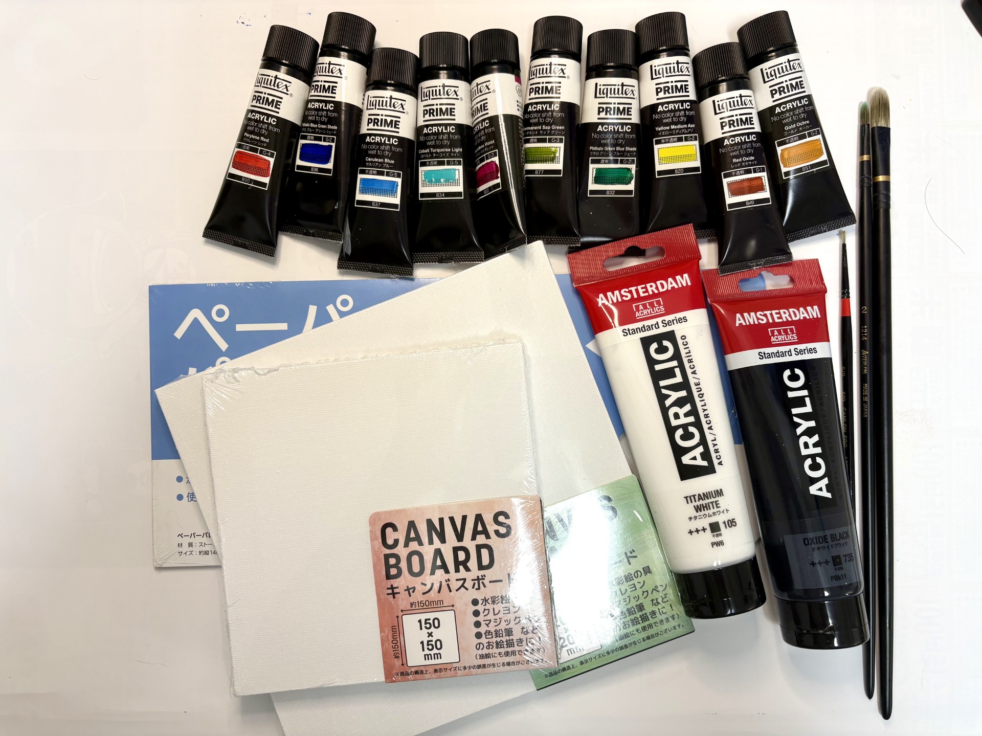 アクリル絵の具はチューブを数色、白、黒、赤、青、黄、緑、などの基本的な色です。確か10本くらいはあったと思います。