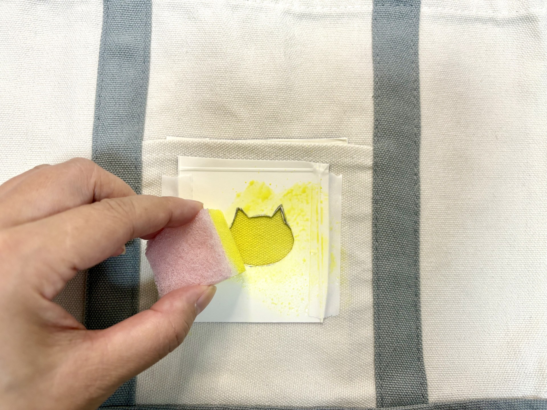 ■↓トートバックに型を置いてスポンジで色をつけました。