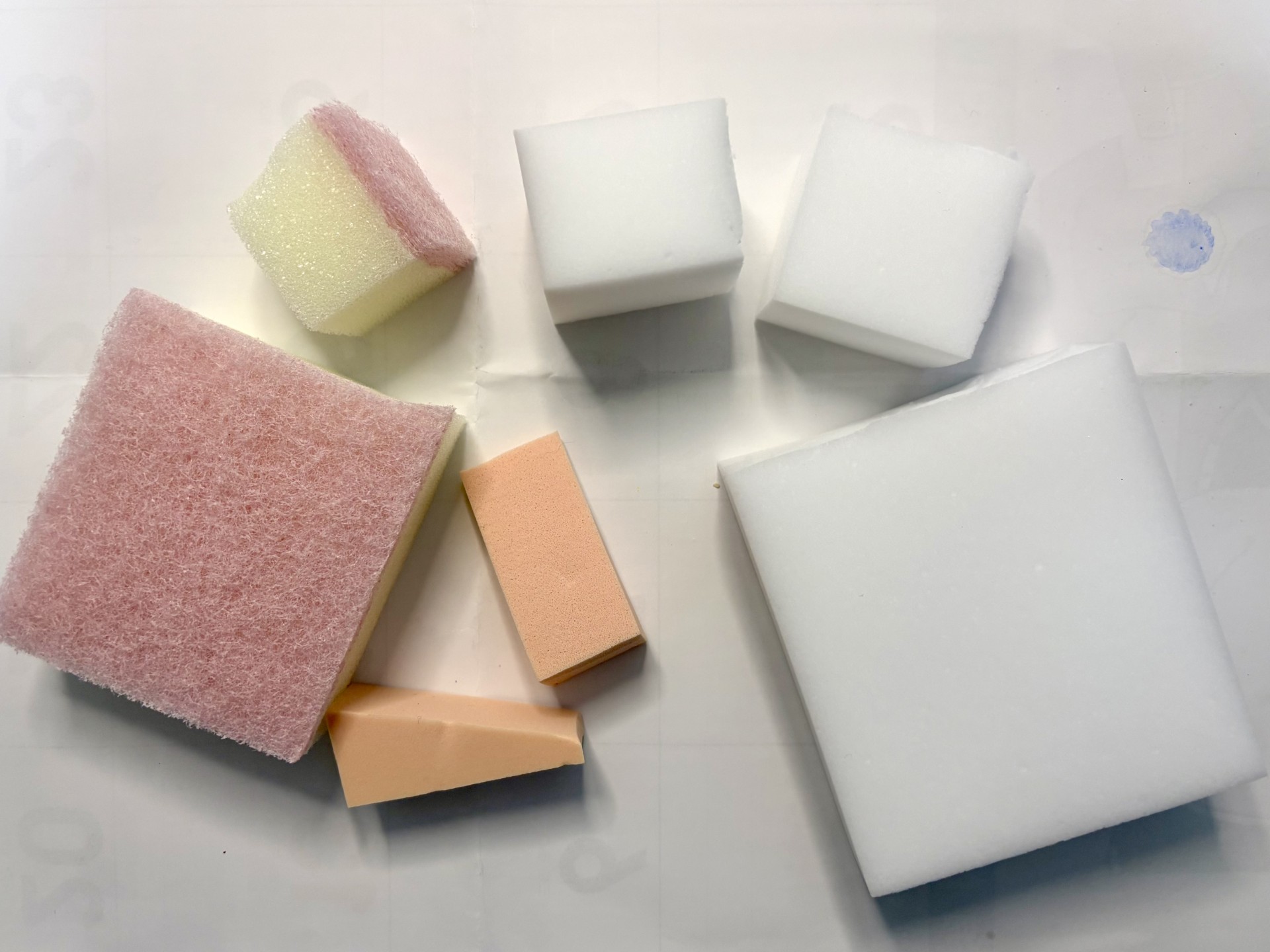 - メラミンスポンジ(メラミンフォーム): メラミン樹脂をミクロン単位で発砲させて作られています。硬さはあるのに細かい網目状の骨格構造を持つ素材のため、絵の具の含みは多いものの、吸い込んでしまうため扱いに慣れが必要。