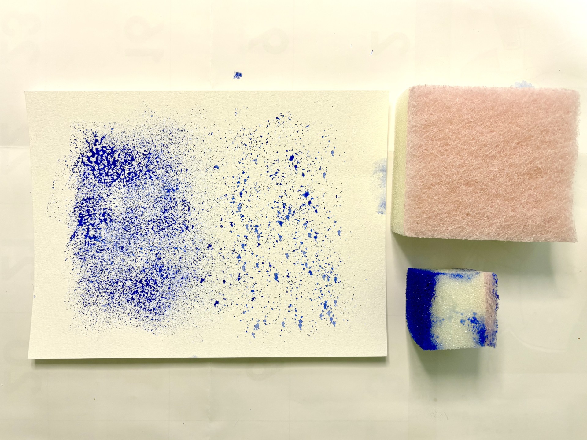 - 食器洗い用スポンジ(硬いセルロース): きめが粗く、絵の具の含みが多い。大胆で荒々しい、ざらっとしたテクスチャや、泡のような表現に使える。