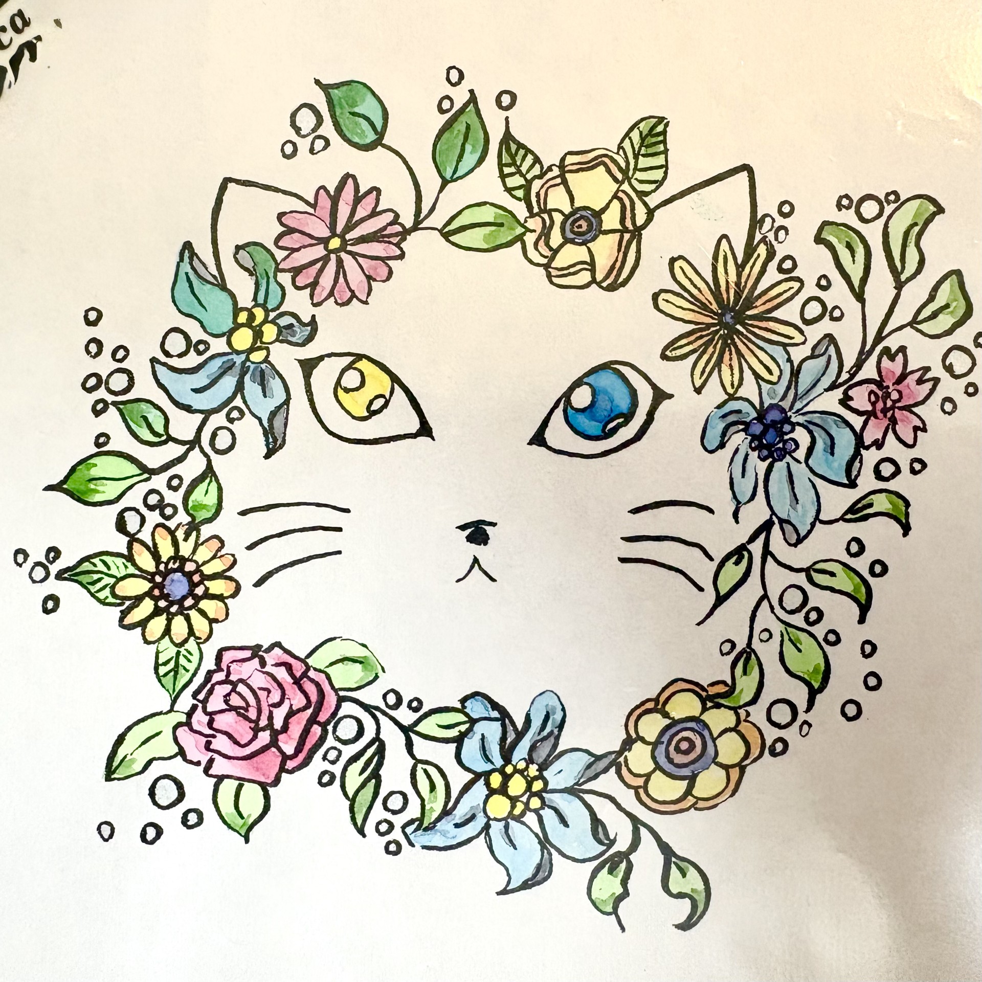 ■↑『オッドアイ白猫と花飾り』(筆ペン、顔彩)特徴である目と耳を描き、顔の輪郭や体は省きました。背景代わりに花の飾りをつけました。